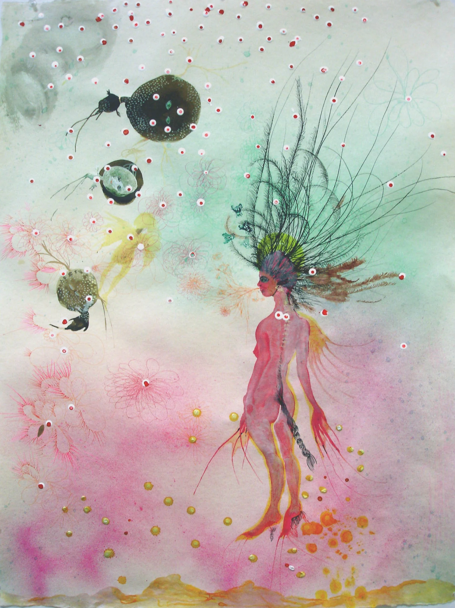 She slithers, she slides, she smiles at the Gardens edge (2007.) Rina stages a feathered and scaled protest against the insidious “policing of what we’re allowed to look like.” She’s bent what makes or breaks beauty. The “snarling sisters” (Laura Steward) of her craft show the suspicious place between pleasure and danger, a land that’s been censored and gagged. […]in a fluster of transgression, abject by birth[…] (2011) The innards and outwards of her figures dance in blurred discipline as their maker tugs at the threads of decorum. “I’m very maximum with what I put in my work:” sweet simplicity made large and catapulted towards a new horizon. Shapes malformed and explosive colours shake the constant bombardment women face by being evaluated for their physique. Immediate ugly sends you to a very beautiful situation, a gentle, winged liberation from the lure of beauty in visual information. Her breath of blood and her hair of glass could siren all disease to fantastic end (2006.) Banerjee has corrupted Venuses and encouraged an understanding of the good looks and bad reputation of hybridity, Ground has risen to sprout new plant [...] (2013)
