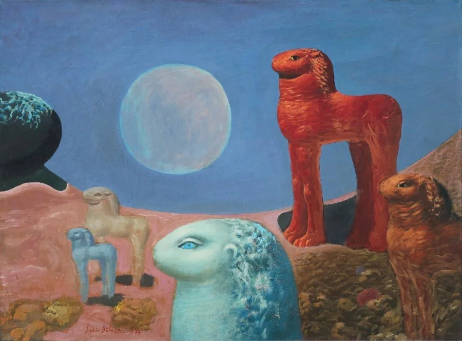 “How does your head look to your eyes? Well, I'll tell you. It looks like what you see out in front of you. Because all that you see out in front of you is how you feel inside your head.” These are the words of Alan Watts (The World as Emptiness II, Part 6: Consider Death Now.) To someone well-acquainted with - or freshly introduced to - the work of Romanian artist, painter, muralist, poet, animator and writer Sabin Bălașa (1932-2008) these words could also nod to the description of the process that released the beauty of the blue hues that follow us even after the quickest glance. Sabin Bălașa described his work as belonging to Cosmic Romanticism. The word cosmic in itself suggests vastness, a cluster of concepts beyond earth and time and a rebellious travel through universal laws. Whichever words critics and historians have used to describe him or the effect of his work, they always hark back to the depths of what lives inside his head or rather, what his mind was able to reach. They speak of the way it stored diverging knowledge inside an undulating brain to then digest it, understand it and lastly, present it. How strange it is, then, that I came to know of the work of this golden artist through a coincidental purchase of 1982 Romanian postage-stamps that feature his paintings. Is this what Bălașa does? Did what he saw inside his head help him travel beyond our logical understanding of time? Did his eyes reach ours by his own disobedient world-mail system? In the words of Mircea Deac, in his living and still today, Bălașa aspired to “an ascertainable eternal time.”